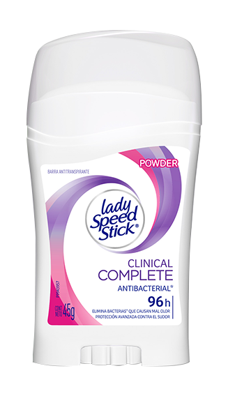Lady Speed Stick® Clinical Complete Protection bloquea sudor y combate mal olor. Protege hasta 96 horas sin residuos o mal olor en la piel.