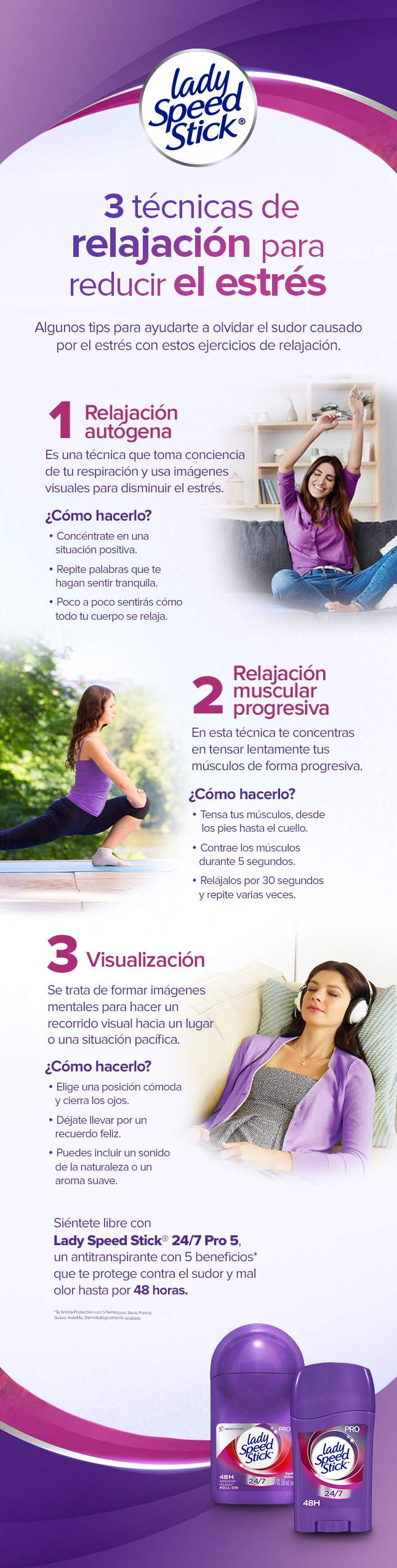 Otra manera de disminuir tus niveles de estrés emocional es aplicar ciertas técnicas de relajación. Te compartimos algunas opciones muy sencillas de realizar en casa: relajación autógena, relajación muscular progresiva y visualización.