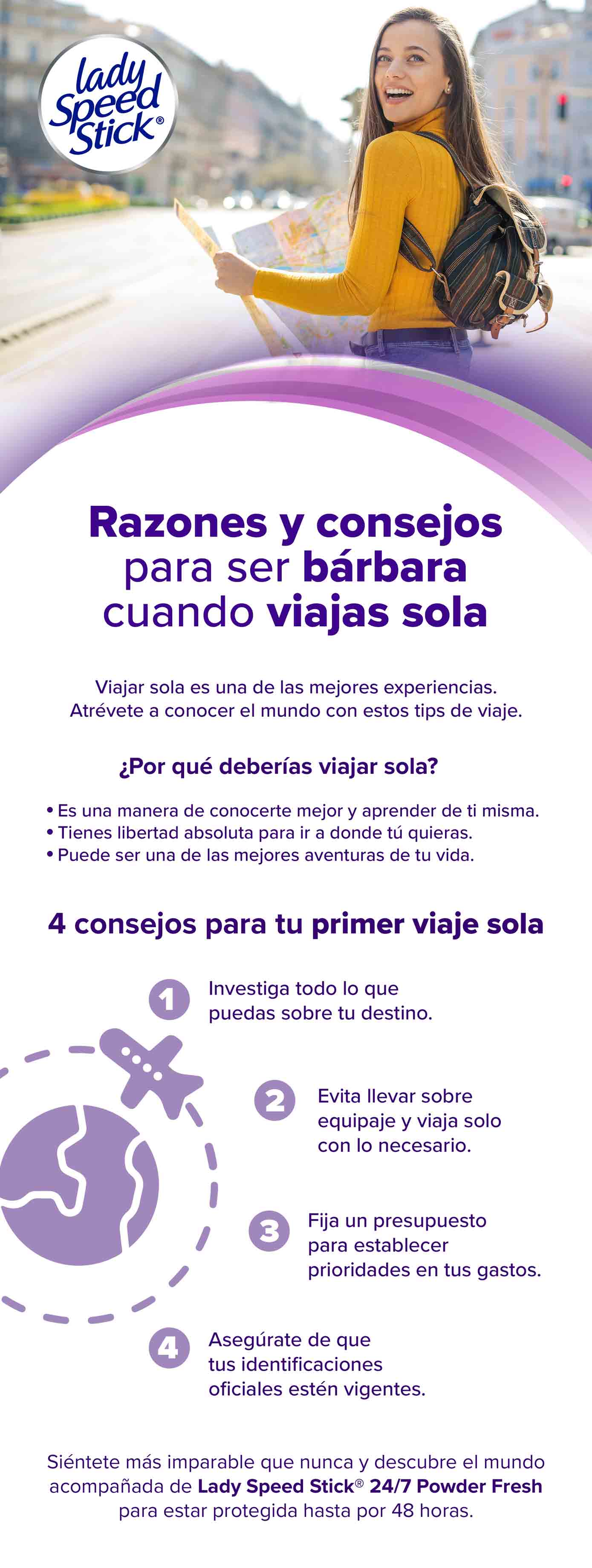 Siéntete libre para viajar a donde tú quieras y descubre el mundo acompañada de Lady Speed Stick® 24/7 Powder Fresh, que te protege contra el sudor y mal olor hasta por 48 horas.